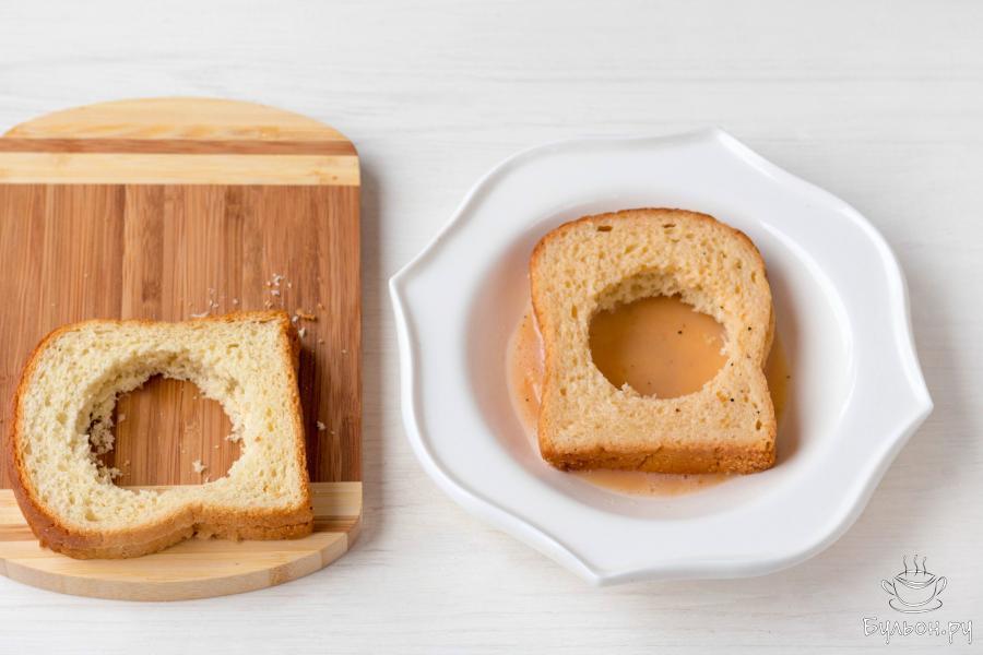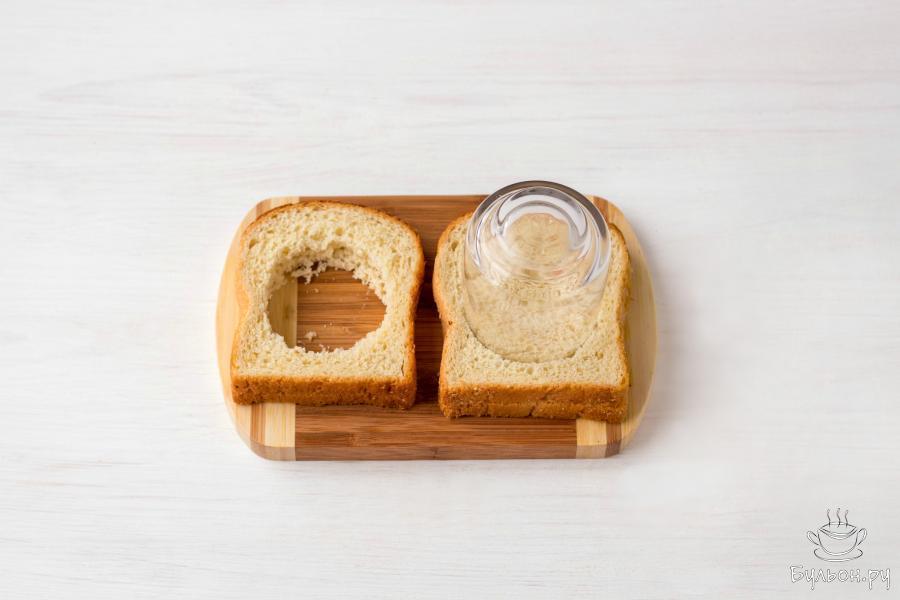 2. Используя нож, бокал или фигурную форму для печенья, вырежьте в мякише хлеба небольшое отверстие.