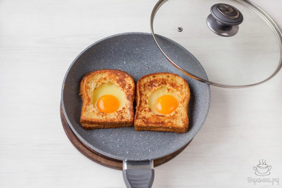 8. Прикройте сковороду крышкой и на небольшом огне готовьте блюдо еще несколько минут, до желаемой степени готовности яичного желтка.