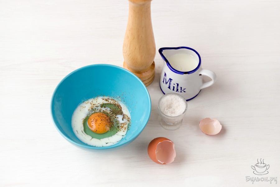 3. В отдельной емкости соедините 1 куриное яйцо и 1 столовую ложку молока. Добавьте несколько щепоток соли и молотого черного перца, а затем взбейте смесь вилкой несколько секунд, до получения однородной массы.