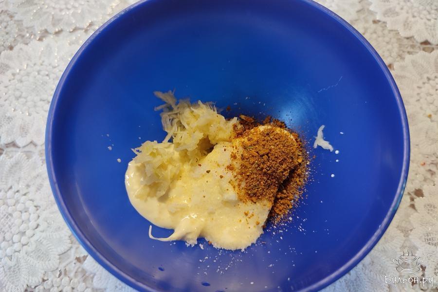 2. В миске соединить майонез, щепотку соли, специи для мяса (курицы) и измельченный на терке чеснок.