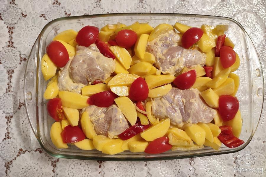 7. В жаропрочной форме разместить овощи и мясо. Накрыть фольгой и поставить в духовку, разогретую до 180 градусов.