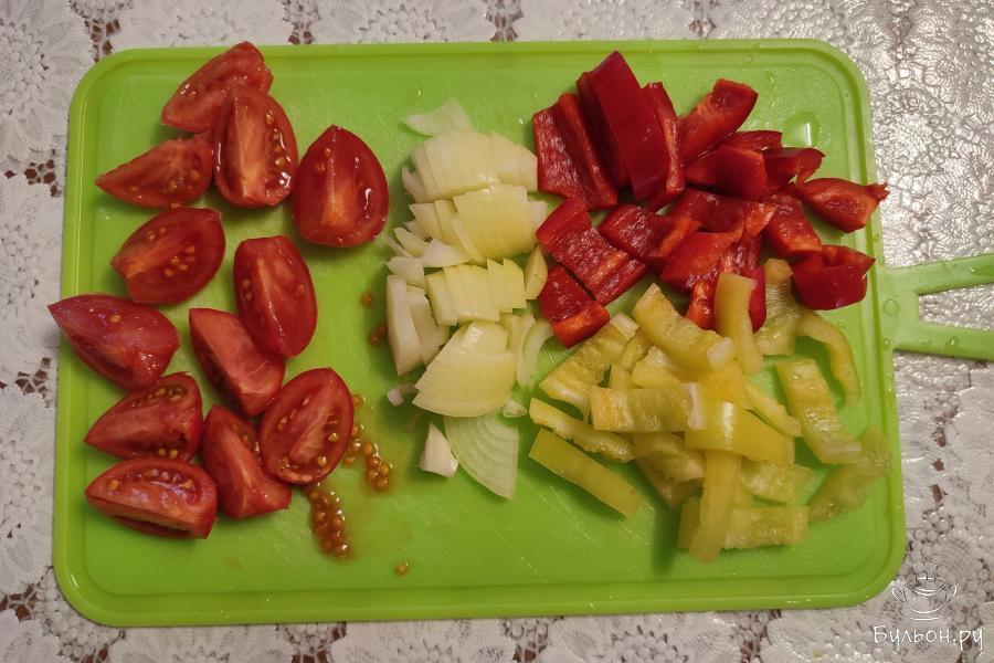 5. Помыть помидоры, перец и лук. Перец нарезать соломкой (можно взять половину красного перца, половину желтого, будет красиво смотреться), лук порезать четверть кольцами, помидоры разрезать на четвертинки.
