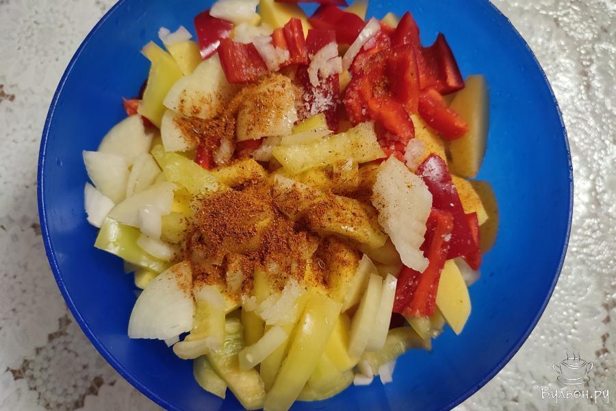 6. В миску поместить картошку, перец и лук. Добавить 2 щепотки соли, растительное масло и приправу для овощей. Перемешать.