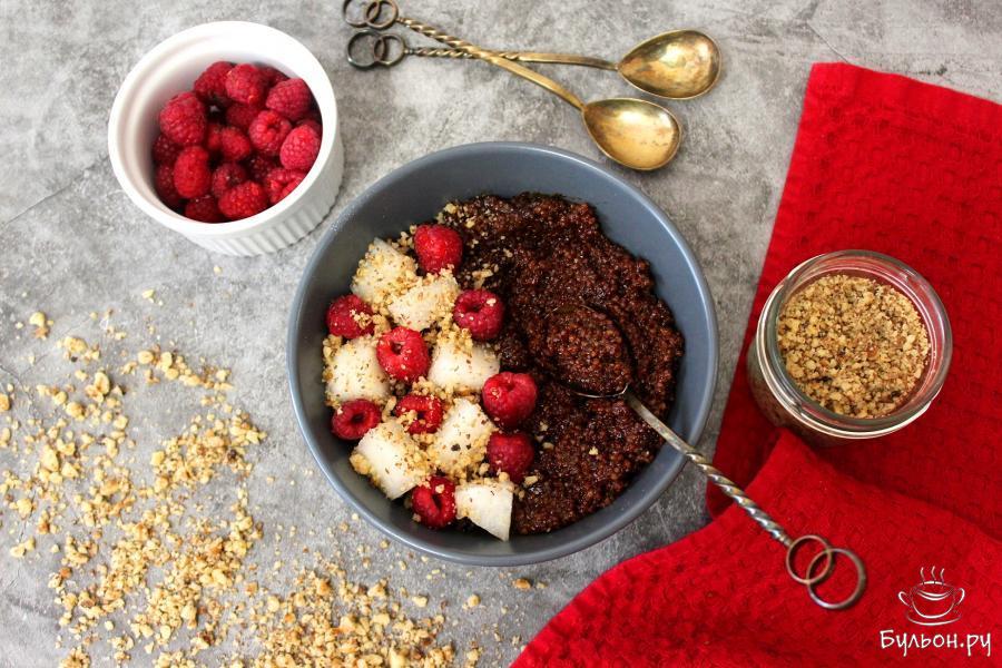 7. Теплый шоколадный кускус разложить по тарелкам, сверху украсить ягодами, фруктами, орехами и подать на стол вместе с горячим свежезаваренным чаем.