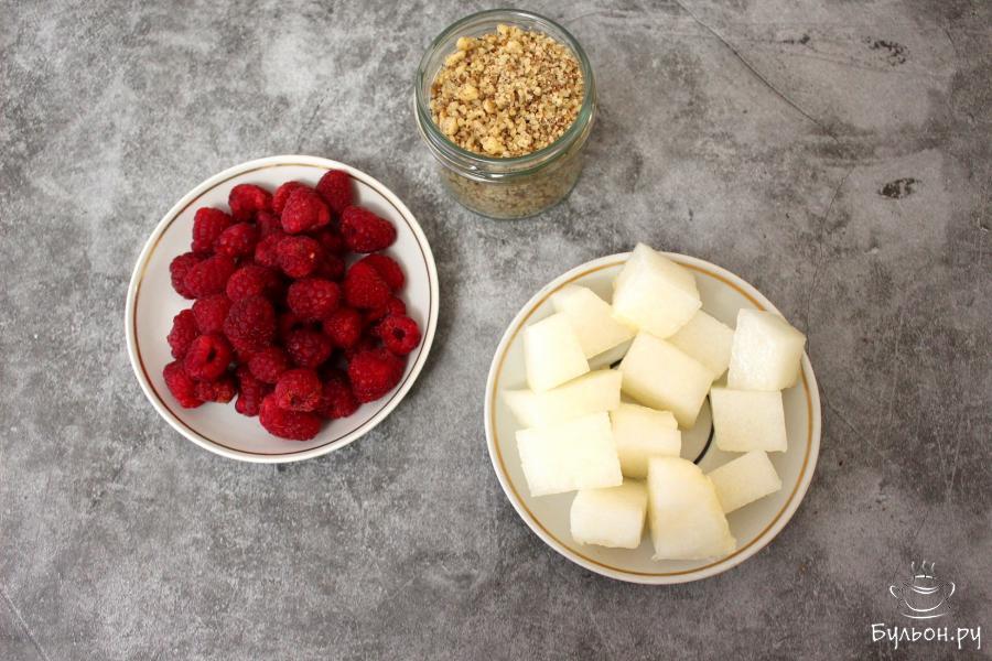 6. Промыть малину и дать ей немного подсохнуть, дыню нарезать порционными кусочками, грецкие орехи измельчить в блендере.