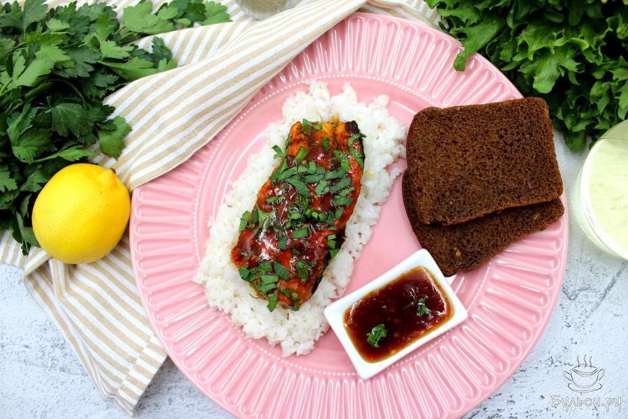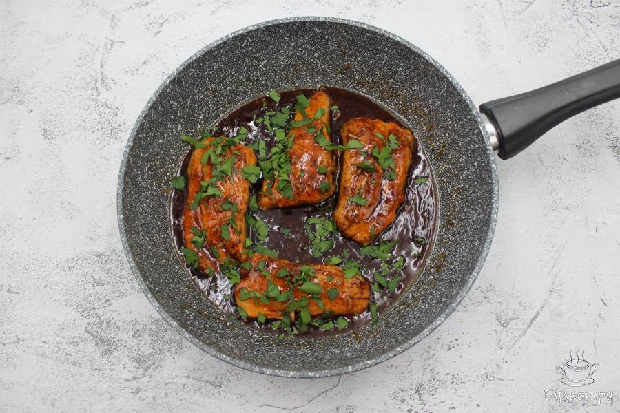 5. Обжаренный лосось вернуть в сковороду, сверху полить несколько раз соусом и посыпать измельченной петрушкой.