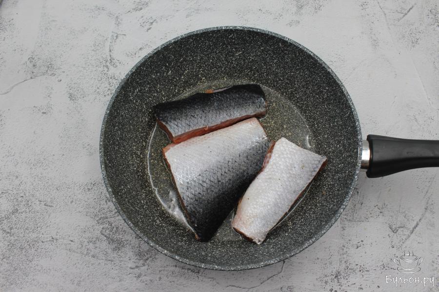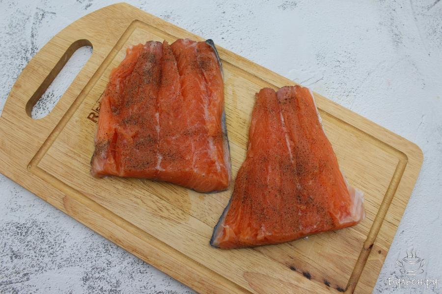 1. Лосось очистить от чешуи, промыть под водой и промокнуть бумажными полотенцами. Так как у меня хвостовая часть, я еще разрезала ее на 2 части и удалила главную кость. Вы же можете использовать медальоны, стейки. Рыбу посолить и поперчить.
