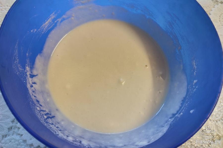 1. В миске в теплом молоке размешать сухие дрожжи, сахар и 100 г муки. Оставить опару в тепле на 20 минут.