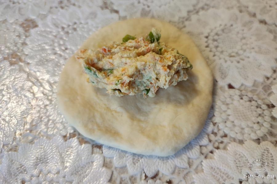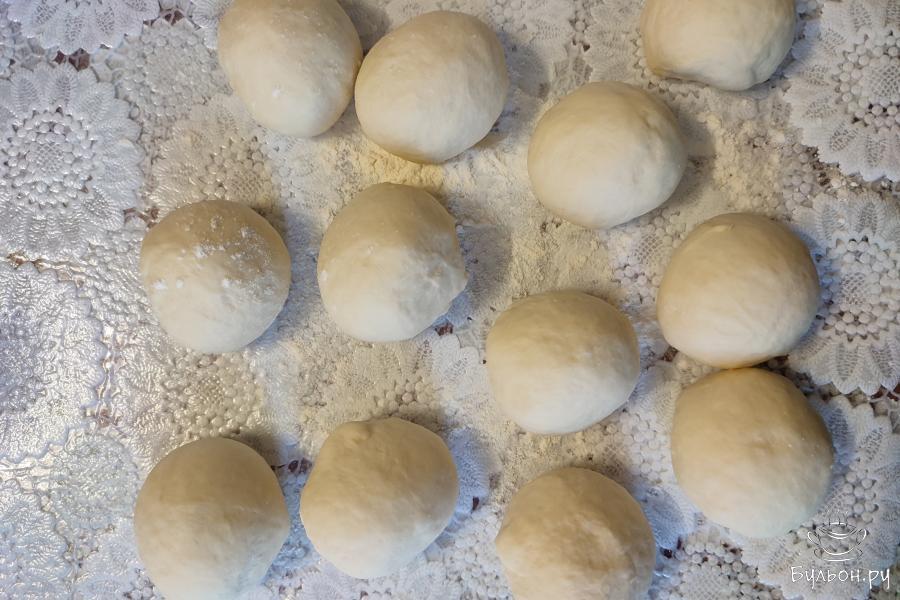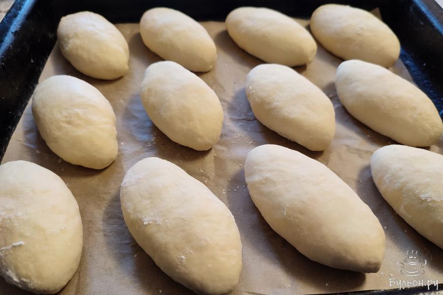 12. Противень застелить пергаментом, разложить пирожки, оставляя расстояние между ними. Оставить пирожки на расстойку на 20-30 минут, накрыв полотенцем.