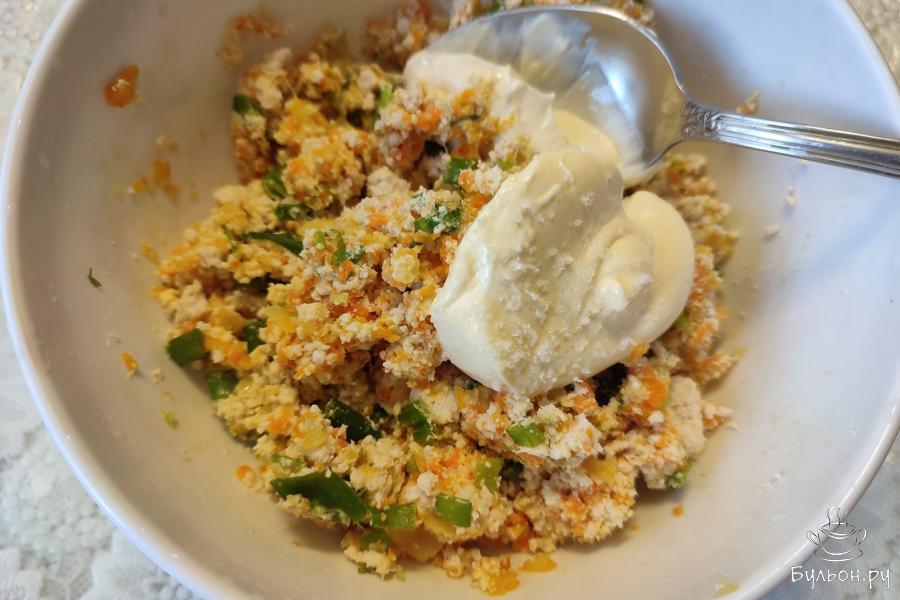 8. Смешать перемолотые мясо и овощи, мелко нарезанный зеленый лук, посолить по вкусу. Добавить 1 ст. л. майонеза. Перемешать.