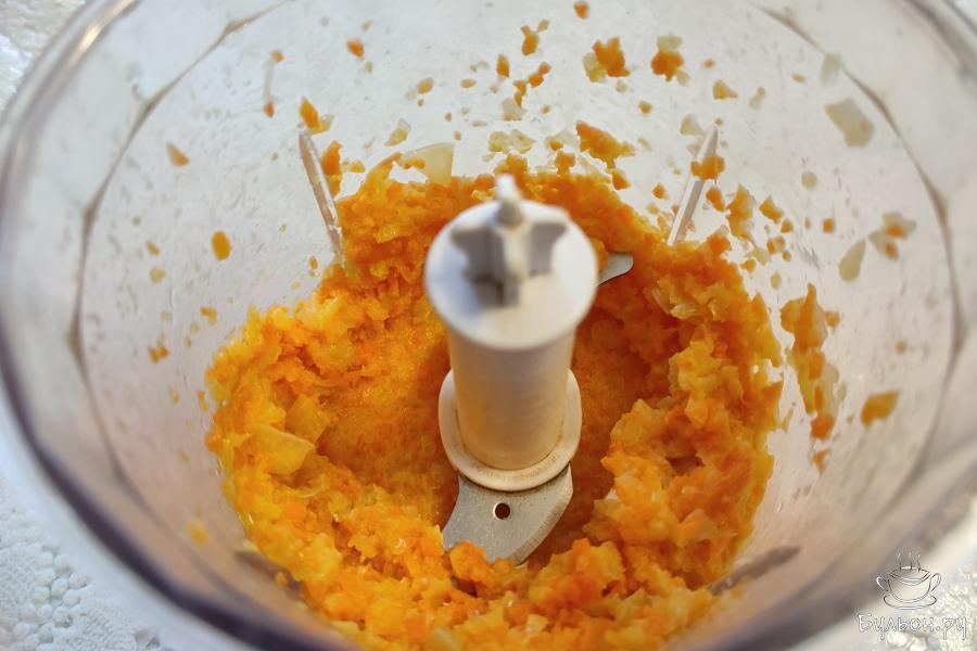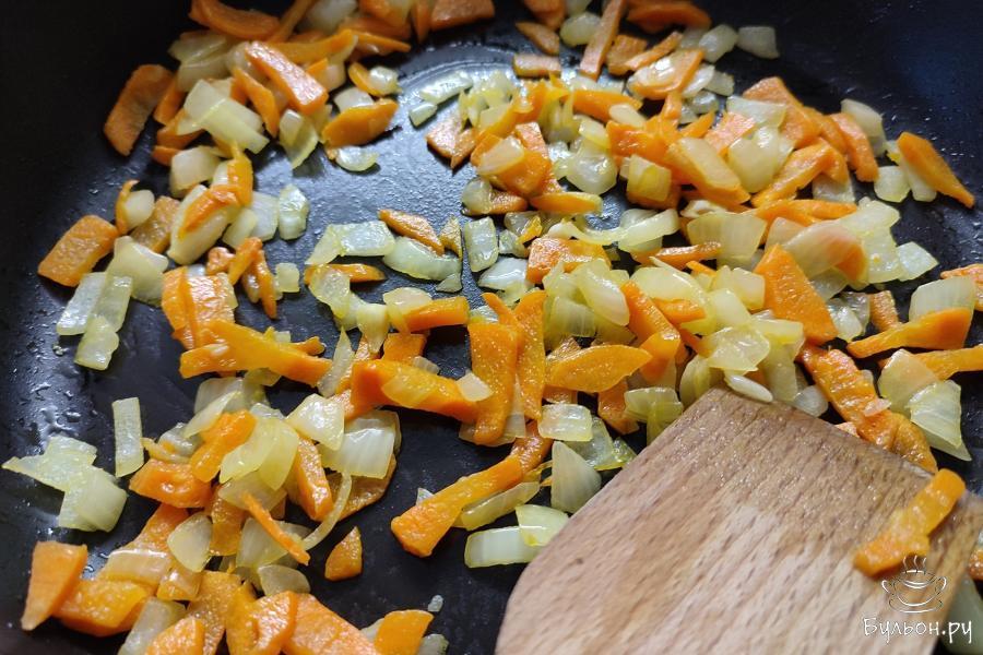 5. Пока варится мясо, морковь и лук почистить и нарезать небольшими кусочками. Обжарить 5 минут на небольшом количестве растительного масла (3 ст. л.).
