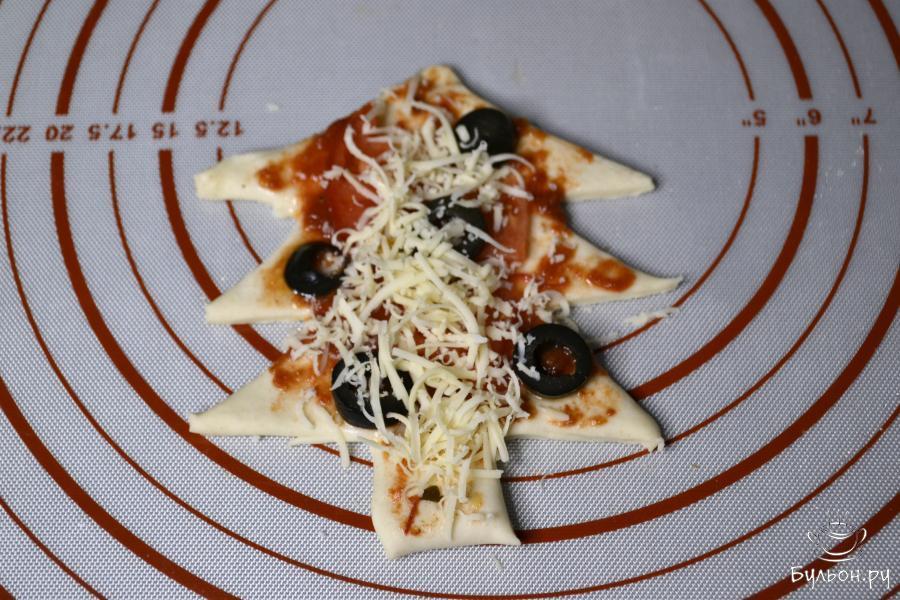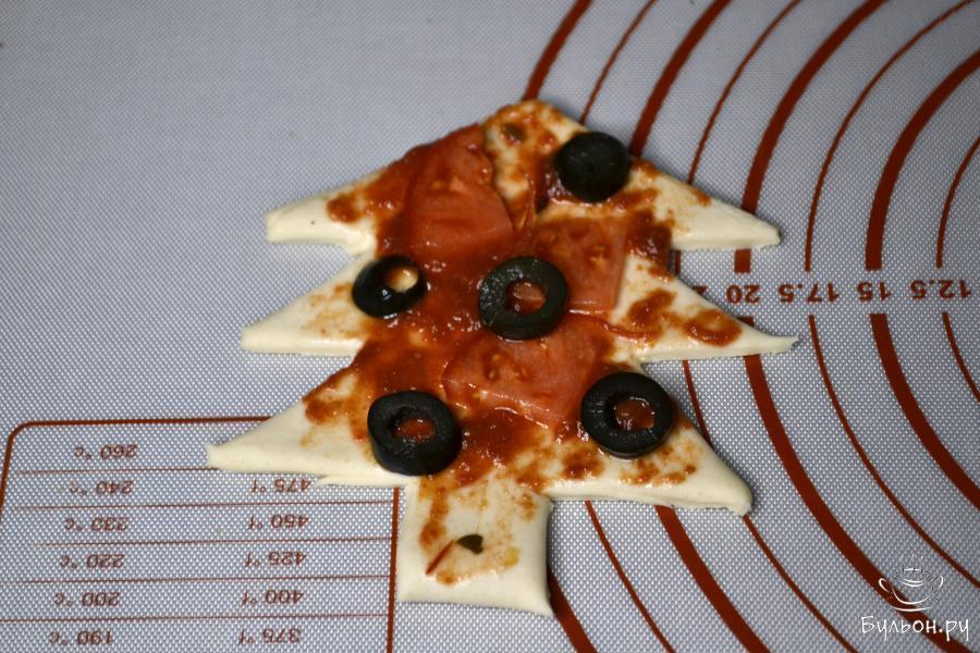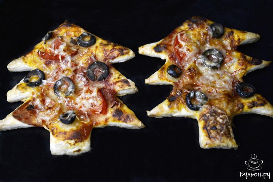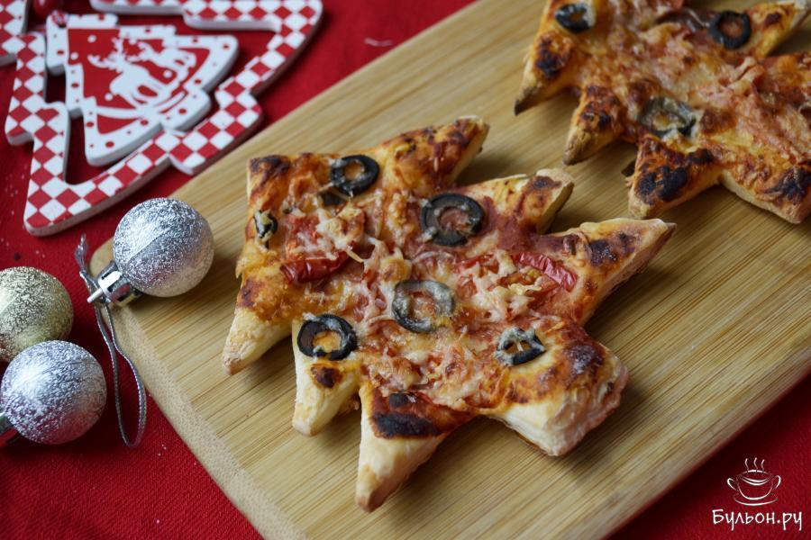 Из слоеного теста можно приготовить маленькие пиццы в форме новогодних елочек. В качестве игрушек на елке будут колечки из маслин и кусочки помидоров. Вырежьте из пласта слоеного теста елочки, смажьте их кетчупом, положите нарезанные на кружочки маслины и помидоры, а сверху присыпьте натертым сыром. Елочки можно сделать любого размера, но маленькие будут смотреться милее. Такие елочки хорошо подать на новогодний стол для своей семьи.