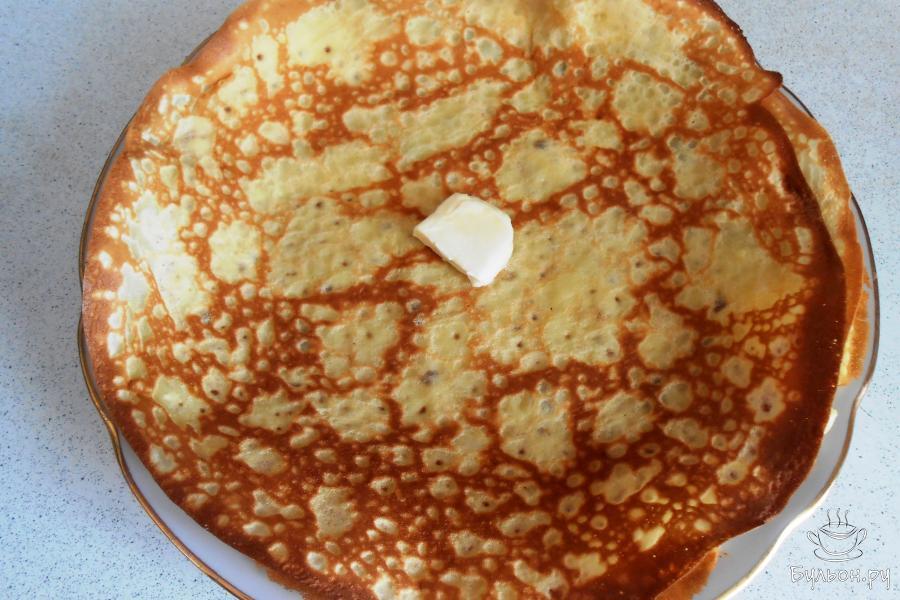 Предлагаю приготовить блинчики на закваске с небольшим количеством муки. Блинчики получаются очень тонкие и вкусные. Каждый блинчик нужно смазывать кусочком сливочного масла, таким образом блины получаются нежными. Использую домашние яйца и домашнюю закваску, муки всего 10 ложек, но с горкой. Обжаренные блинчики на сале получаются не жирными с насыщенным вкусом. Подавать лучше в теплом виде с любимым вареньем или сгущенкой.