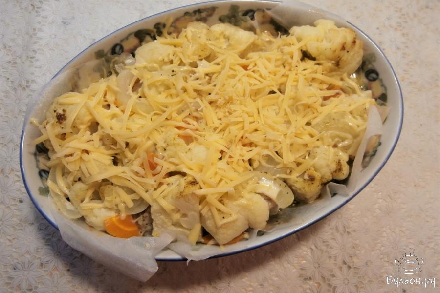 6. Далее, фольгу нужно убрать, а блюдо посыпать тертым сыром и снова поместить в духовку еще на 15 мин.