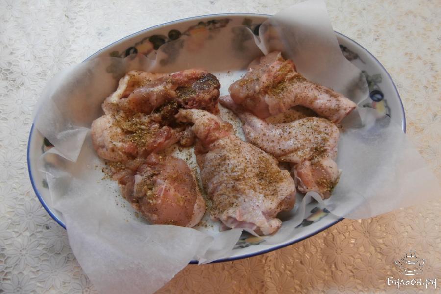 1. Курицу порезать на части, выложить в форму, которую нужно застелить пергаментом. Мясо посолить и посыпать приправой для курицы.
