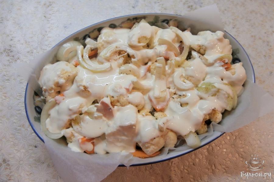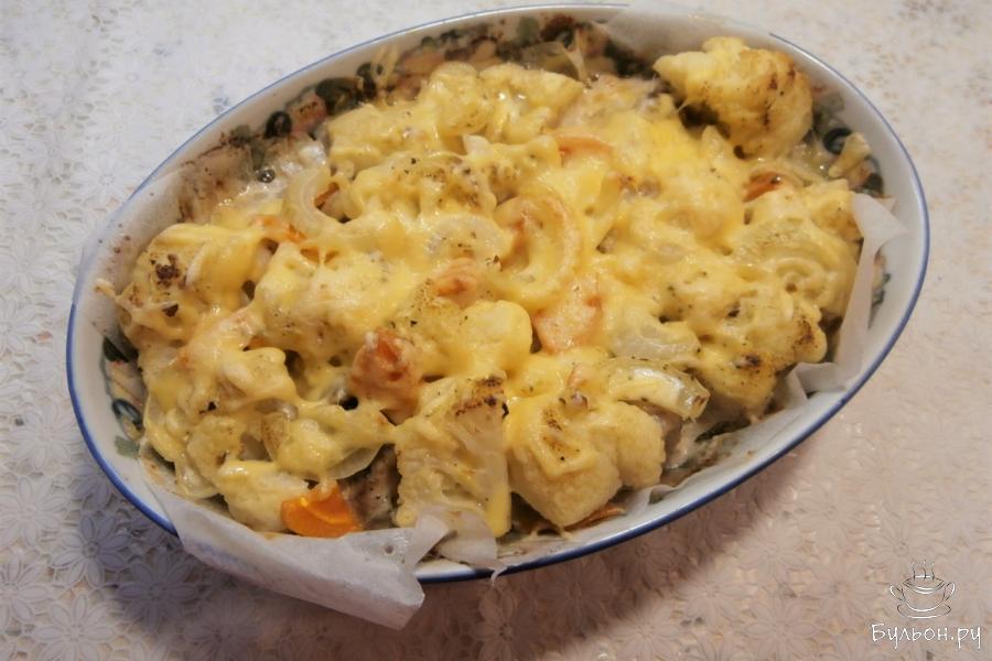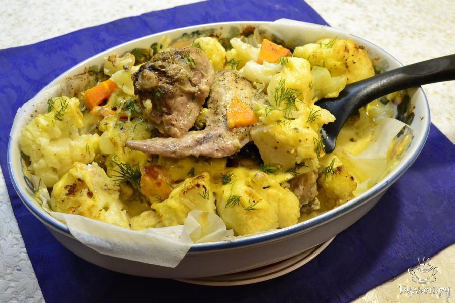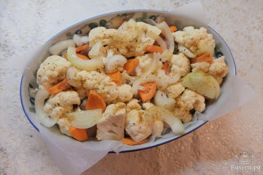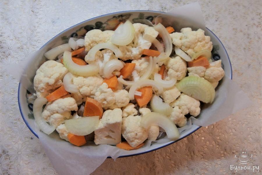 2. Между курицей и сверху разместить соцветия цветной капусты, порезанных произвольно лук и морковку