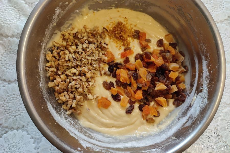 6. Изюм и курагу залить кипятком, оставить на пять минут. Затем сухофрукты просушить, курагу нарезать на небольшие кусочки. В тесто ввести сухофрукты, лимонную цедру и измельченные орехи.
