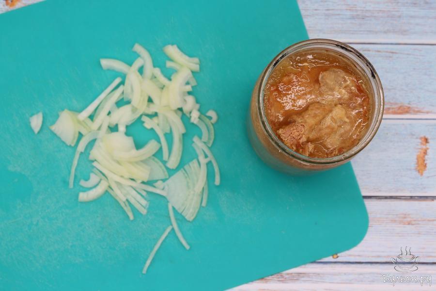 2. Пока варится картофель, вскрыть банку с тушенкой. Лук почистить, нарезать тонкими полосочками. На сковороду выложить немного жира из банки, на нем обжарить лук до золотистого цвета.