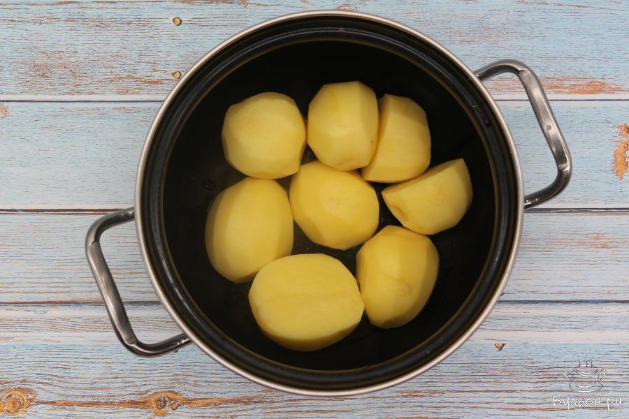 1. Картофель очистить. Чтобы сварить его быстрее, можно разрезать его. Затем залить водой, довести до кипения, варить до мягкости примерно 30 минут.