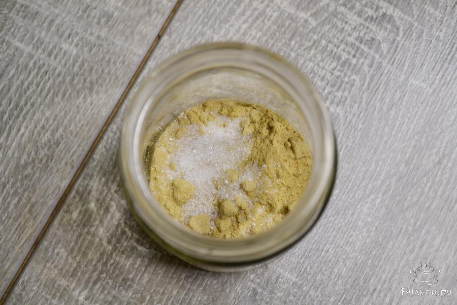 2. Добавить к горчице сахар. Перемешать порошок с сахаром. Соль не нужно добавлять, так как рассол и так соленый.