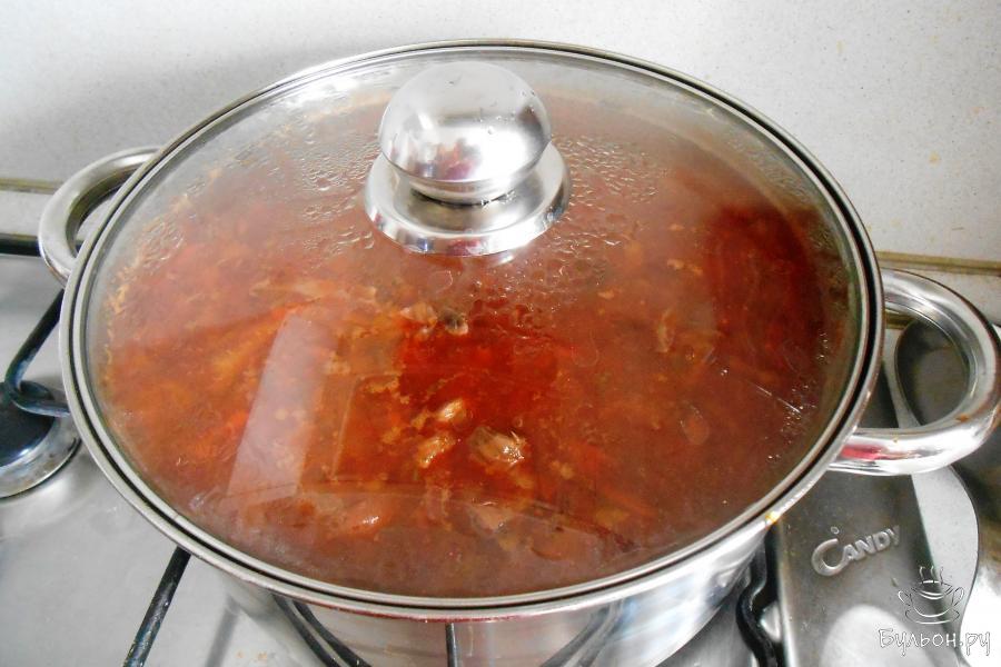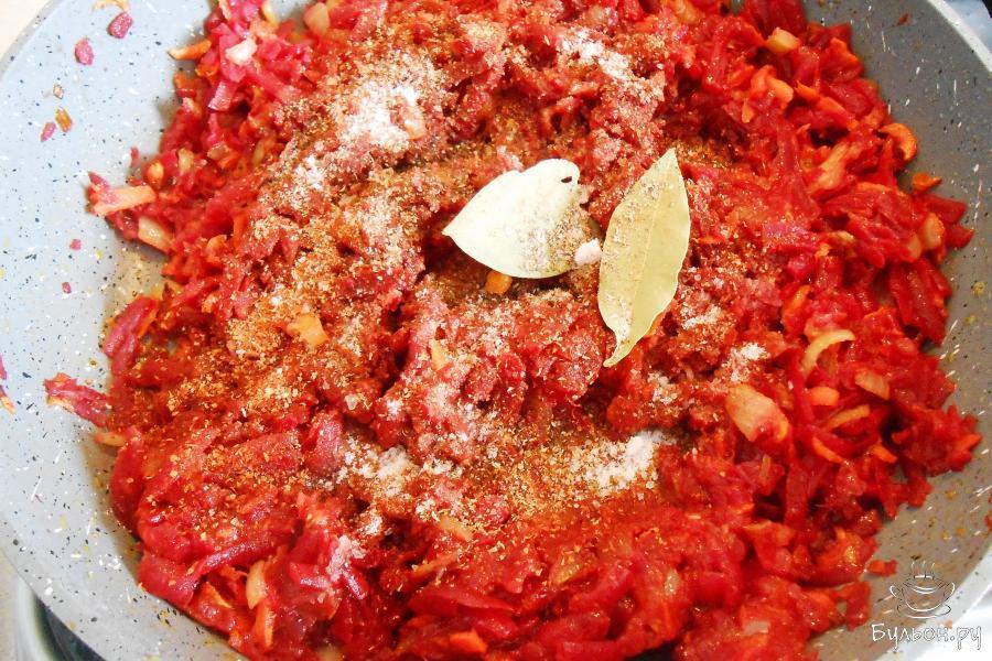 11. Добавить в зажарку воду, томатную пасту, лавровые листы, молотый кориандр, соль и перец. Перемешать и тушить 10 минут под крышкой на медленном огне.