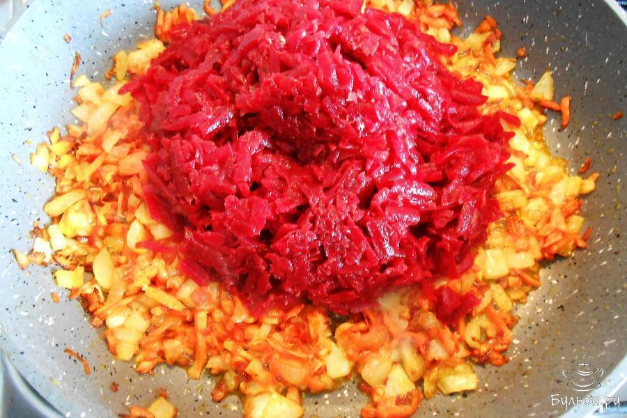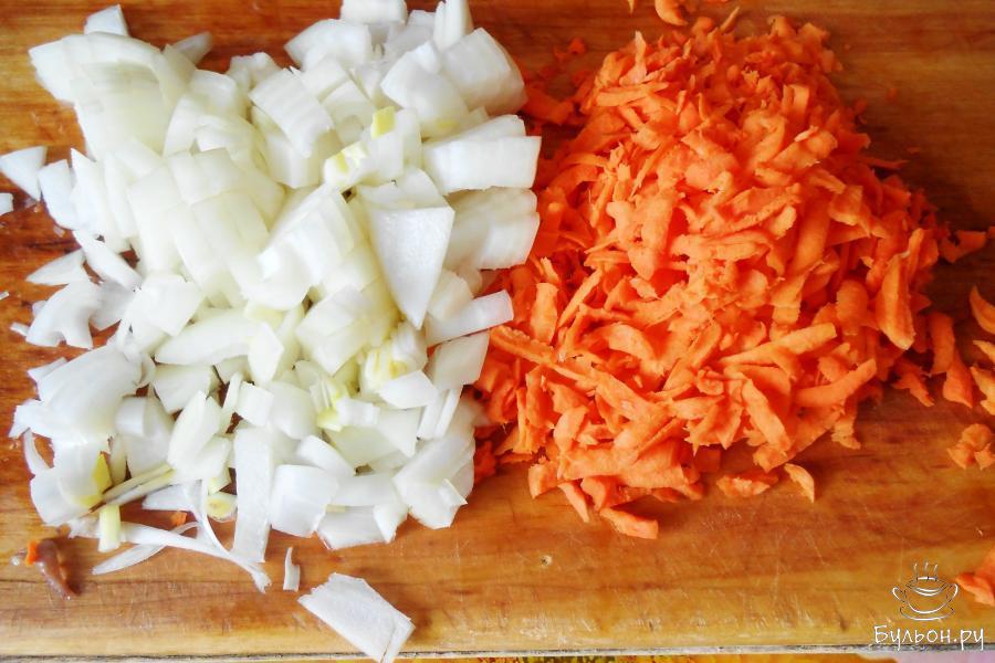 8. Лук, свеклу и морковь почистить и помыть. Лук нарезать кубиками, морковь и свеклу натереть на крупной терке.