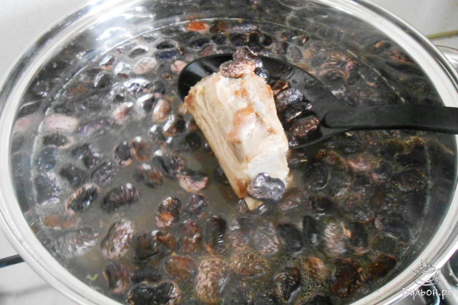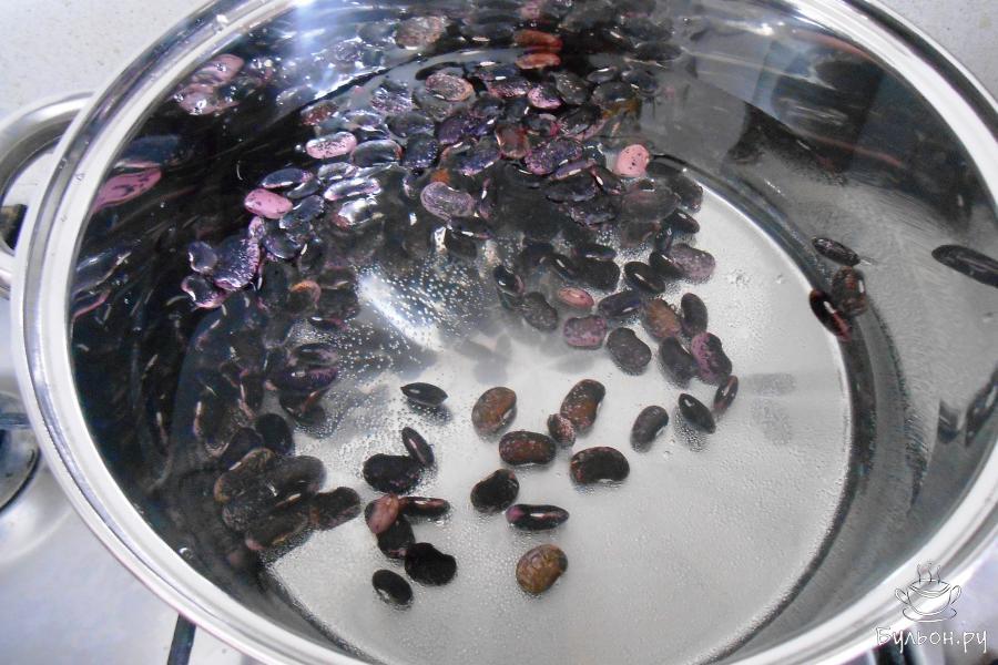 1. Фасоль промыть и залить 3,5 л воды, довести до кипения и варить на медленном огне под крышкой 1 час.