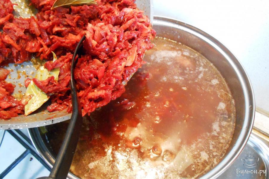 Очень много есть вариантов приготовления борща, но с жареными телячьими ребрышками я еще не встречала на просторах интернета. Поэтому поэкспериментировав, предлагаю вашему вниманию рецепт вкуснейшего борща. Блюдо получается ароматным и сытным, а бульон наваристым. В рецепте использована синяя фасоль, но можно заменить и на белую. Я выбрала телячьи ребра - они мягче и быстрее в приготовлении, можно заменить на говяжьи, но нужно и время приготовления увеличить. Борщ лучшего всего подавать горячим со сметаной и пампушками с чесноком. Рецепт "Украинских пампушек с чесноком" есть на этом сайте.