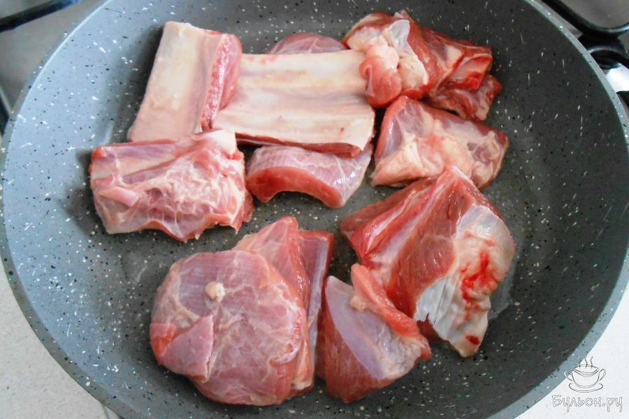 2. Телячьи ребра промыть, просушить и обжарить в небольшом количестве растительного масла с одной стороны до румяности.