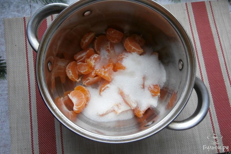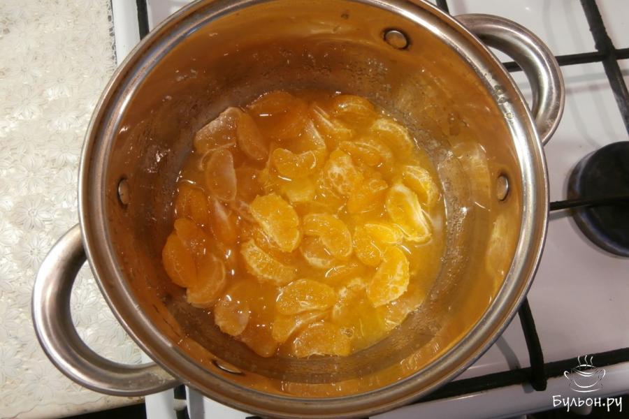 3. Влить две ложки лимонного сока, немного мандарины раздавить толкушкой и поместить кастрюлю на небольшой огонь. Кипятить все около 15 минут, они должны стать мягкими.