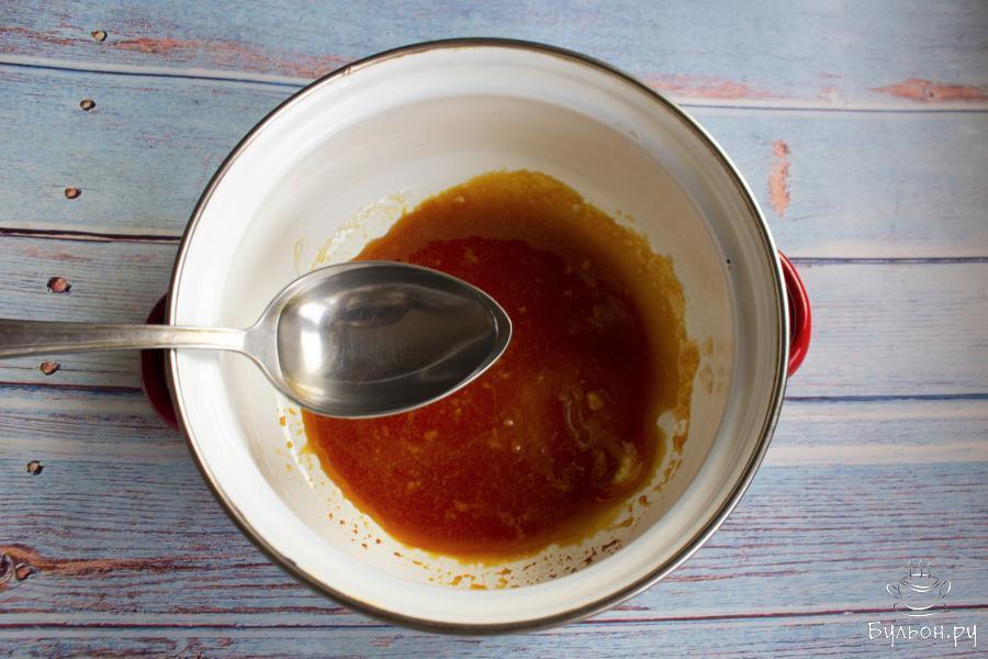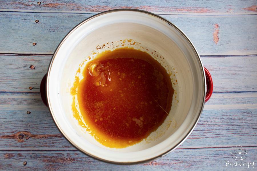 2. Сахар переложить в кастрюльку и на очень маленьком огне расплавить его. Помешивать. Долго на огне сахар не держать, чтобы не было пережженого привкуса.