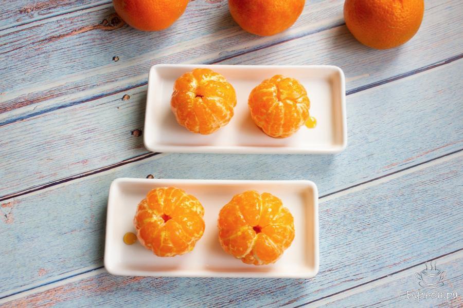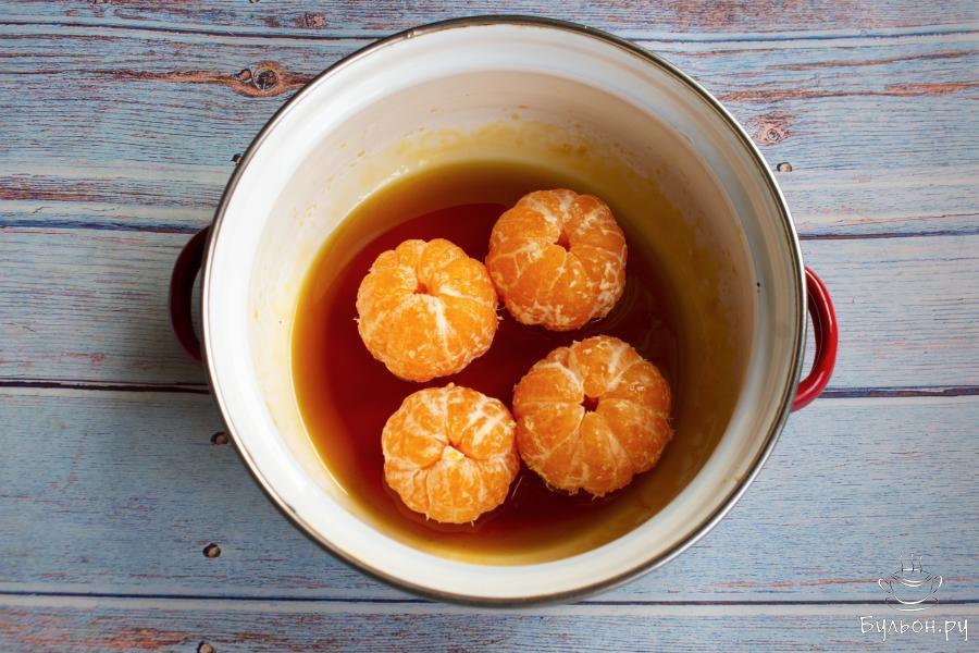 5. Выложить мандарины в карамельный соус и убрать посуду в холодильник минимум на два часа. Периодически мандарины переворачивать в соусе, чтобы они пропитались.