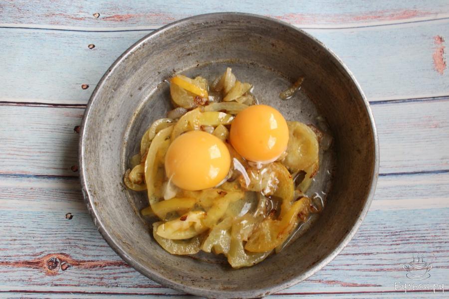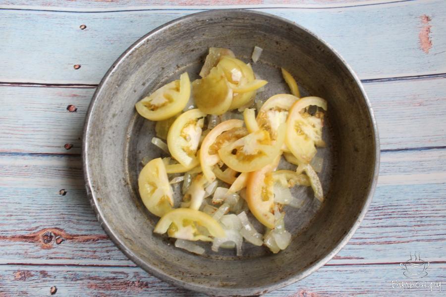 2. Зеленые помидоры промыть, нарезать тонкими полкружочками. Добавить помидоры к луку и обжарить все вместе 10 минут.