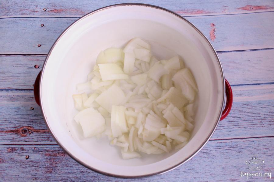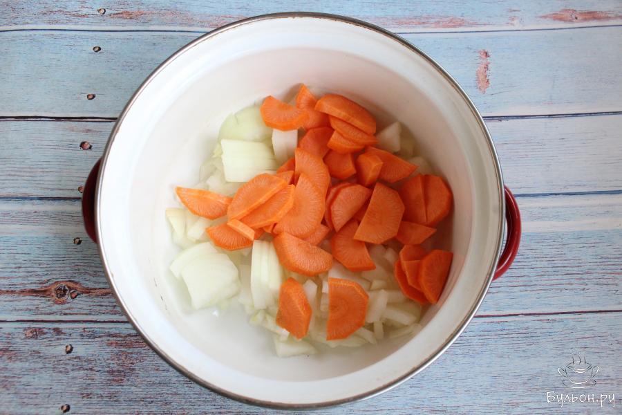 2. Морковь почистить, промыть и нарезать не очень тонкими полукружочками. Добавить морковь к луку, налить воду и поставить суп вариться. Варить 10 минут.