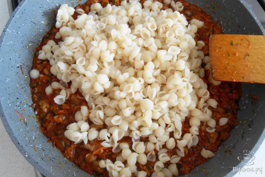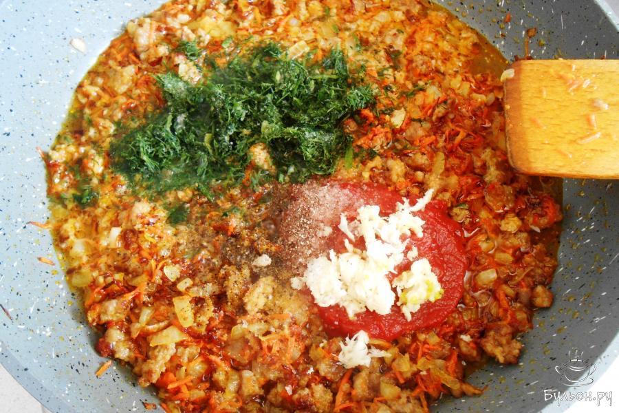 7. Добавить в сковороду воду, выдавленный через пресс чеснок, томатную пасту, измельченный укроп, посолить и поперчить по вкусу. Тушить на медленном огне под крышкой 5 минут.