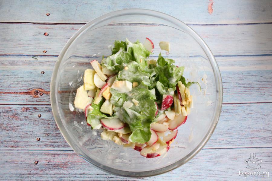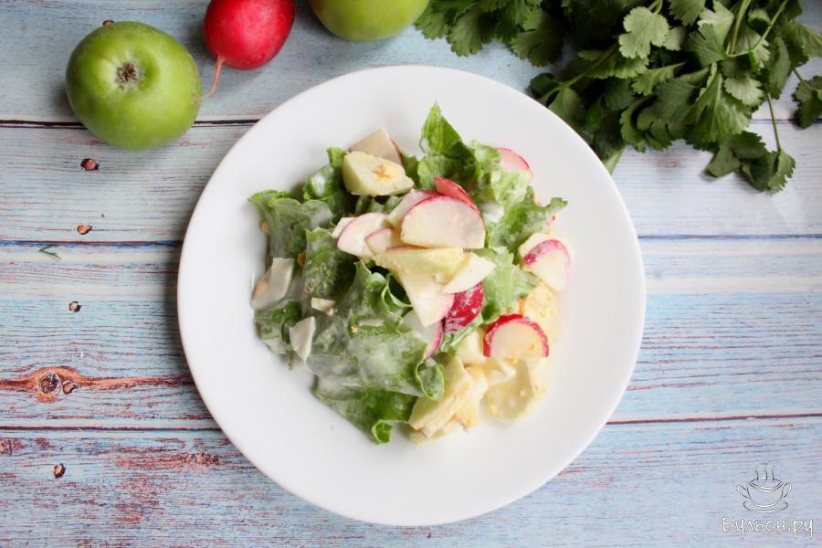 Салат с редисом, яблоком и яйцом получается сочный, хрустящий, вкусный и полезный. Готовится такой салат за считанные минуты. Салат после приготовления нужно сразу подавать к столу, чтобы лист салата не потерял свою пышность. Яблоки для приготовления, желательно, выбирать кислых сортов. Если под рукой нет сметаны, то салат можно заправить и майонезом. Попробуйте приготовить этот легкий салат, наверняка он понравится многим.