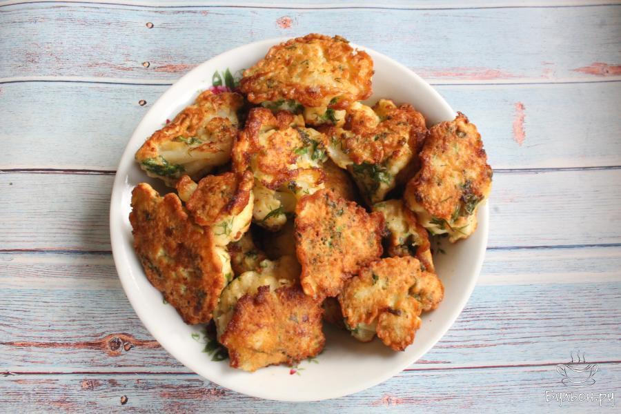 Яркая, ароматная, жареная цветная капуста в яичном кляре с зеленью всегда будет к столу. Такую закуску можно приготовить очень быстро и просто, с приготовлением справится даже начинающий кулинар. Капуста получается нежная, мягкая, сытная и очень вкусная. Зелень для приготовления всегда можно взять ту, которую любите вы и ваши близкие. Попробуйте приготовить жареную цветную капусту по этому рецепту, это вкусно!