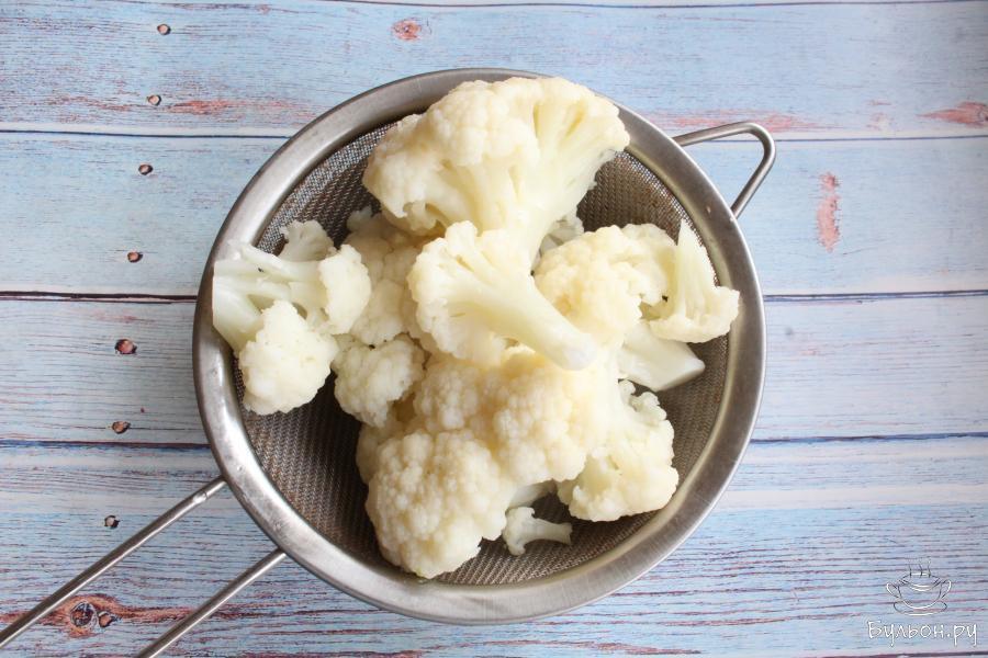 1. Цветную капусту разобрать на небольшие соцветия, промыть и отварить в подсоленной воде почти до готовности. На это уйдет примерно 8-10 минут, зависит от размера соцветий. Откинуть капусту на дуршлаг или сито.