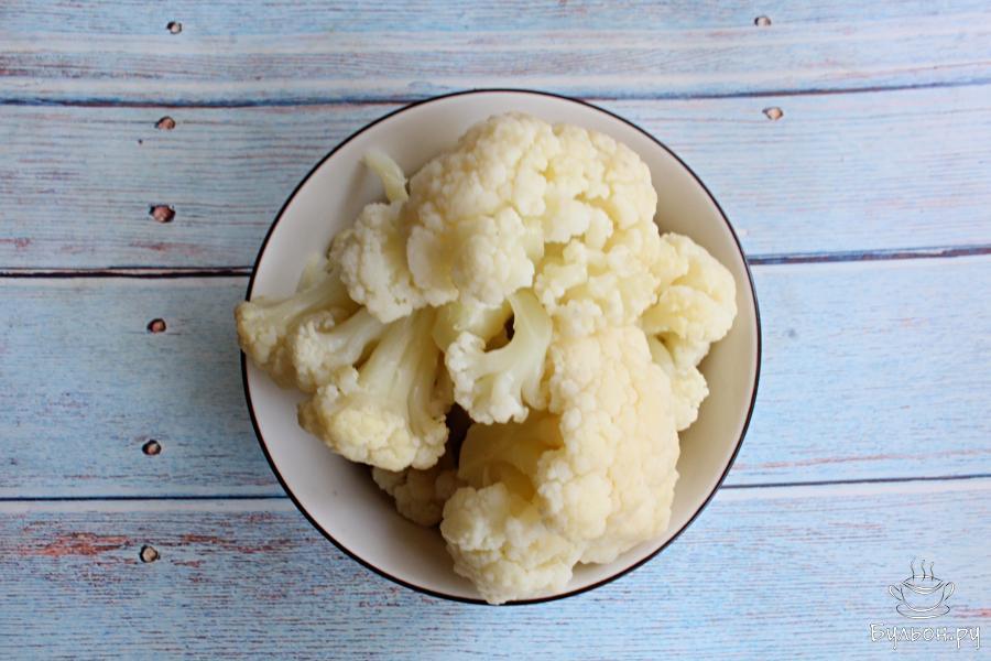 2. Цветную капусту разобрать на небольшие соцветия и промыть. Отварить капусту в подсоленной воде 8-10 минут и откинуть ее на дуршлаг или сито.