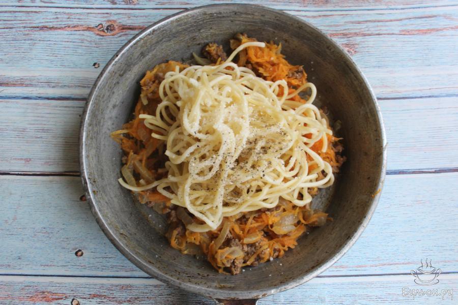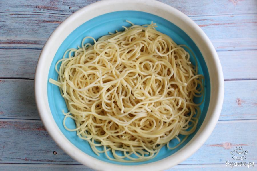 1. Спагетти сварить в подсоленной воде, до готовности. Ориентируйтесь по инструкции на упаковке. Откинуть макароны на дуршлаг.