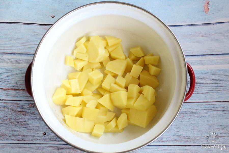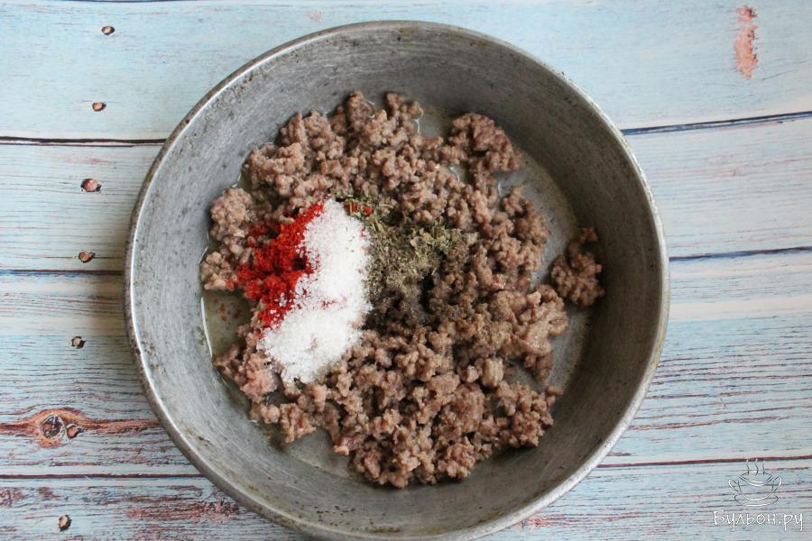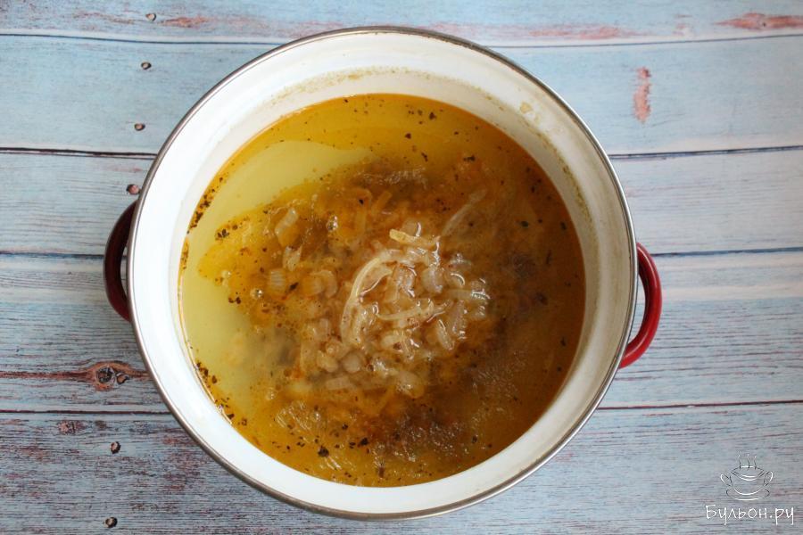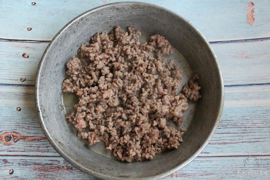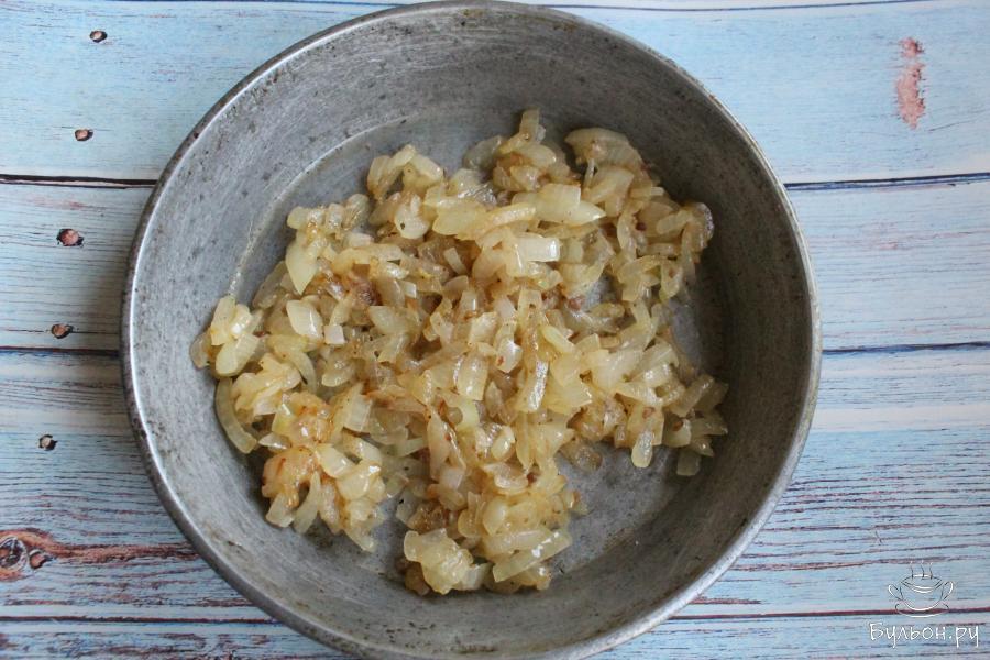 7. Лук почистить, промыть, мелко нарезать и обжарить до мягкости. Жарим лук на той сковороде, где жарили фарш.