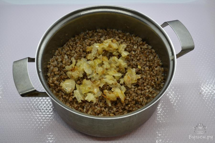 5. Добавить обжаренный лук в готовую гречневую кашу и перемешать. Постная гречневая каша с луком готова.