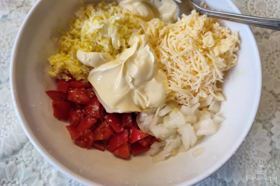 7. Положить в удобную посуду кусочки помидор и лука, а также сыр и яйца, щепотку соли и майонез. Размешать.