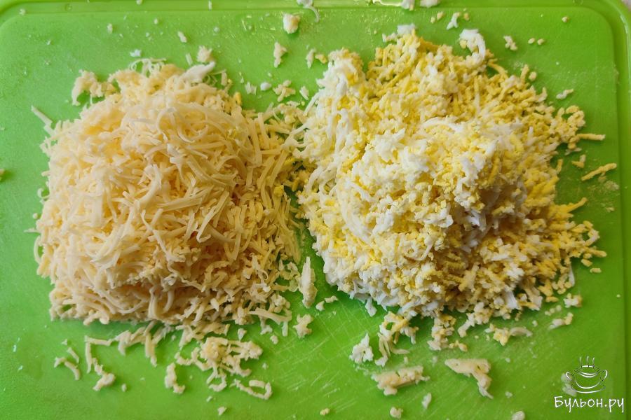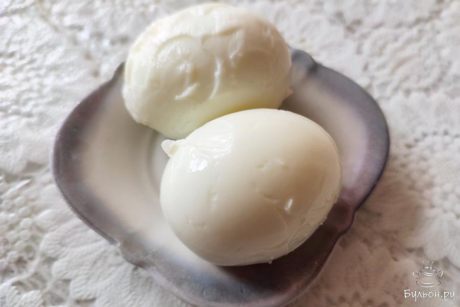 1. Сначала надо отварить яйца до готовности, в течении 10 минут после закипания воды. Остудить и почистить от скорлупы.