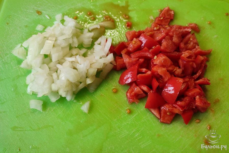 5. Помидоры и лук промыть. Помидоры разрезать пополам, вынуть середину с семенами. Лук почистить. Нарезать помидоры и лук средними кубиками.
