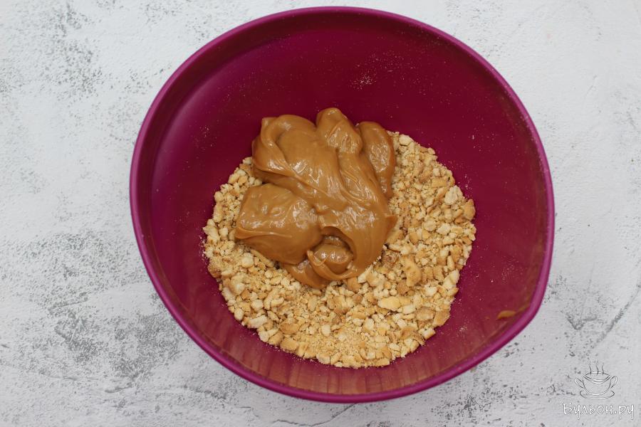 3. Соединить измельченный крекер вместе с вареной сгущенкой, вымешав массу ложкой или руками. Я советую соединять крошку со сгущенкой не всю сразу. Поскольку в зависимости от жидкости вареной сгущенки вам может понадобится разное количество крекерной крошки.