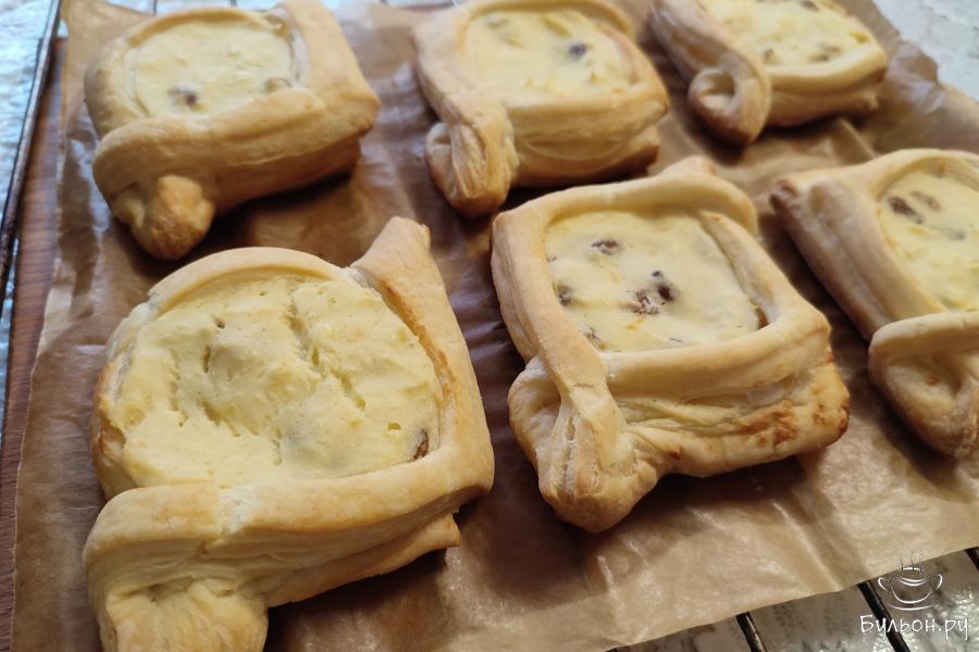Выпечка из готового слоеного теста довольно популярна, так как на активное приготовление уходит относительно небольшое количество времени. Не нужно возиться с тестом лишний раз и к тому же очень удобно в любой момент достать тесто из морозильной камеры, разморозить его и приготовить из него что-нибудь вкусненькое. Например, слойки с творогом из готового теста. Такие слойки очень похожи, по вкусу, на ватрушки. Слойки получаются с хрустящим тестом и нежной сочной начинкой. Домашним обязательно понравится такая выпечка, попробуйте.