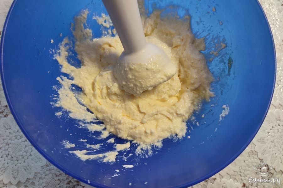 1. В подходящей посуде соединить творог любой жирности, сахарный песок и яйцо. Измельчить до однородности погружным блендером.