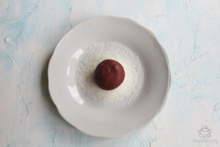 5. Сформировать из теста небольшие шарики. Выложить на тарелку 3 ст. л. простого сахара. Обвалять печенье в сахаре.