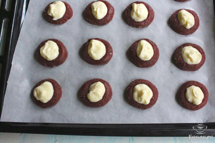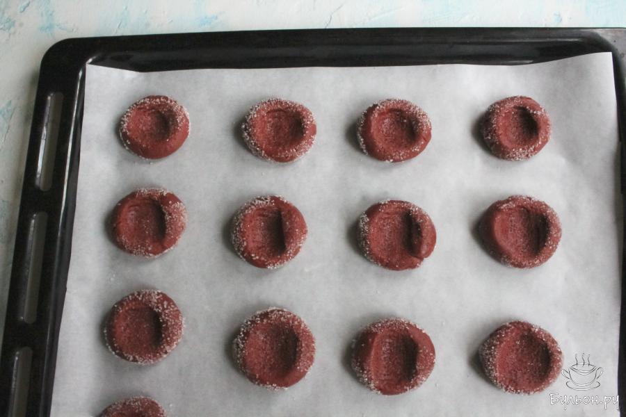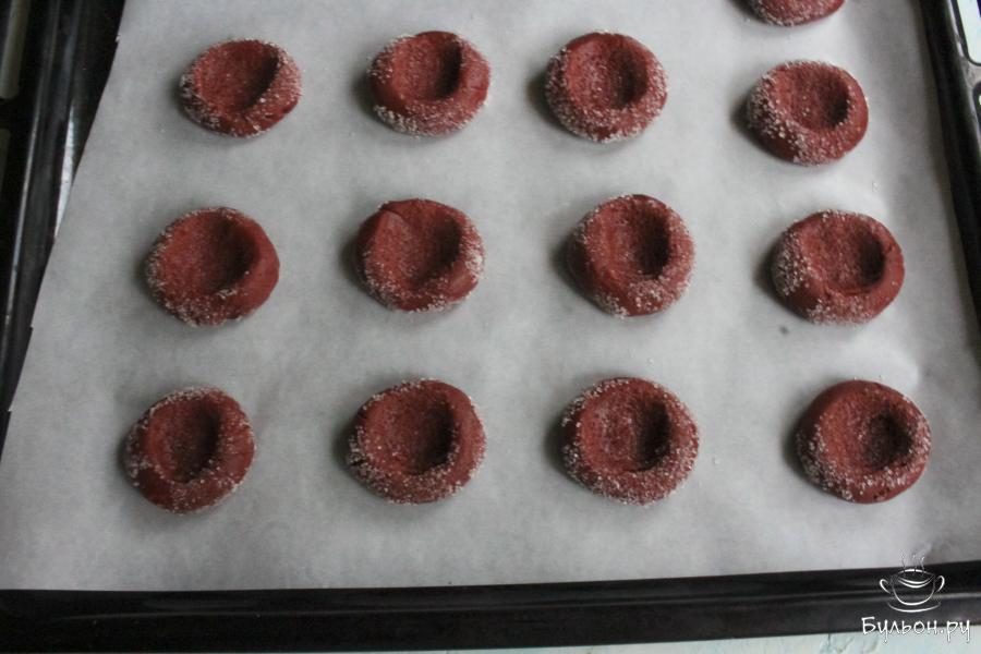 6. Выложить шарики на противень и немного сплющить их рукой. Чайной ложкой вдавить и сделать небольшое углубление под крем в каждой печеньке.